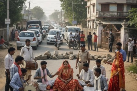 संत कबीर नगर: जिले के खलीलाबाद कोतवाली क्षेत्र के काट गंगा गांव में मंगलवार को उस समय हड़कंप मच गया, जब एक महिला लगभग 10 साल बाद ढोल-मजीरे और बारातियों के साथ अपनी ससुराल पहुंची। लेकिन पति ने दरवाजा नहीं खोला और घर में घुसने नहीं दिया। नाराज महिला ने गांव से गुजरने वाले कांटे-मुंडेरवा मार्ग पर धरना देकर जाम लगा दिया और पति को बाहर बुलाने की जिद करने लगी।