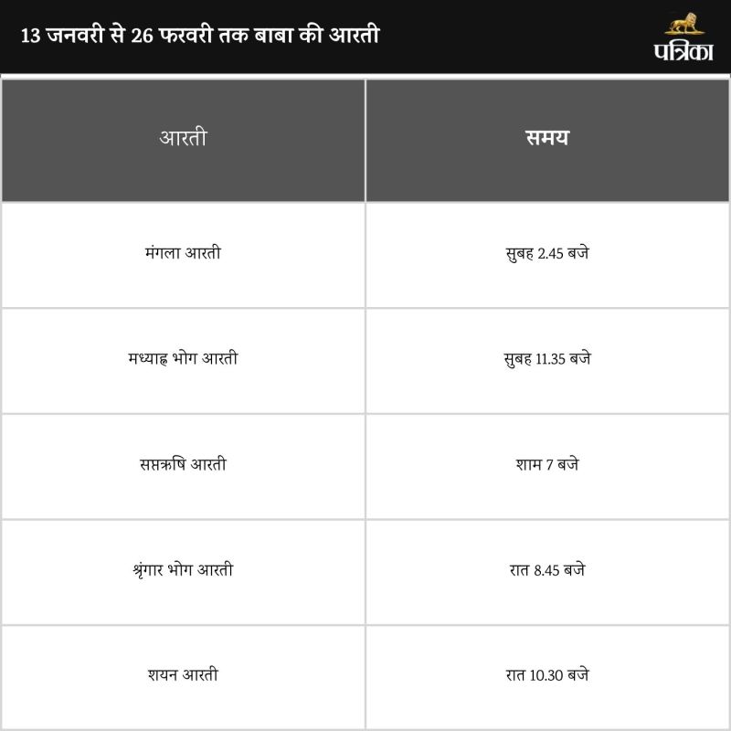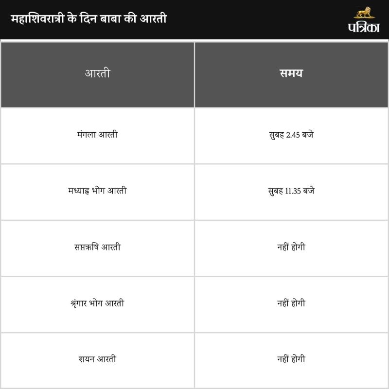 महाशिवरात्रि पर बाबा विश्वनाथ के दर्शन रात भर होंगे। 26 फरवरी की सुबह 2.15 बजे मंगला आरती शुरू होगी, जिसे बाद दर्शन के लिए कपाट खोल दिए जाएंगे। इसके बाद दोपहर में मध्याह्न भोग आरती 11.35 बजे होगी, जिसके बाद करीब 20-25 मिनट के लिए कपाट बंद रहेंगे। इसके बाद शाम को होने वाली सप्तऋषि आरती और रात में होने वाली श्रृंगार भोग आरती नहीं होगी। रात में शयन आरती भी नहीं होगी।